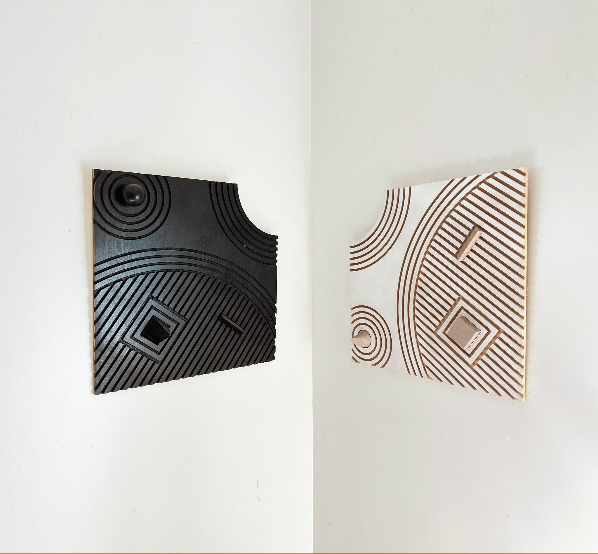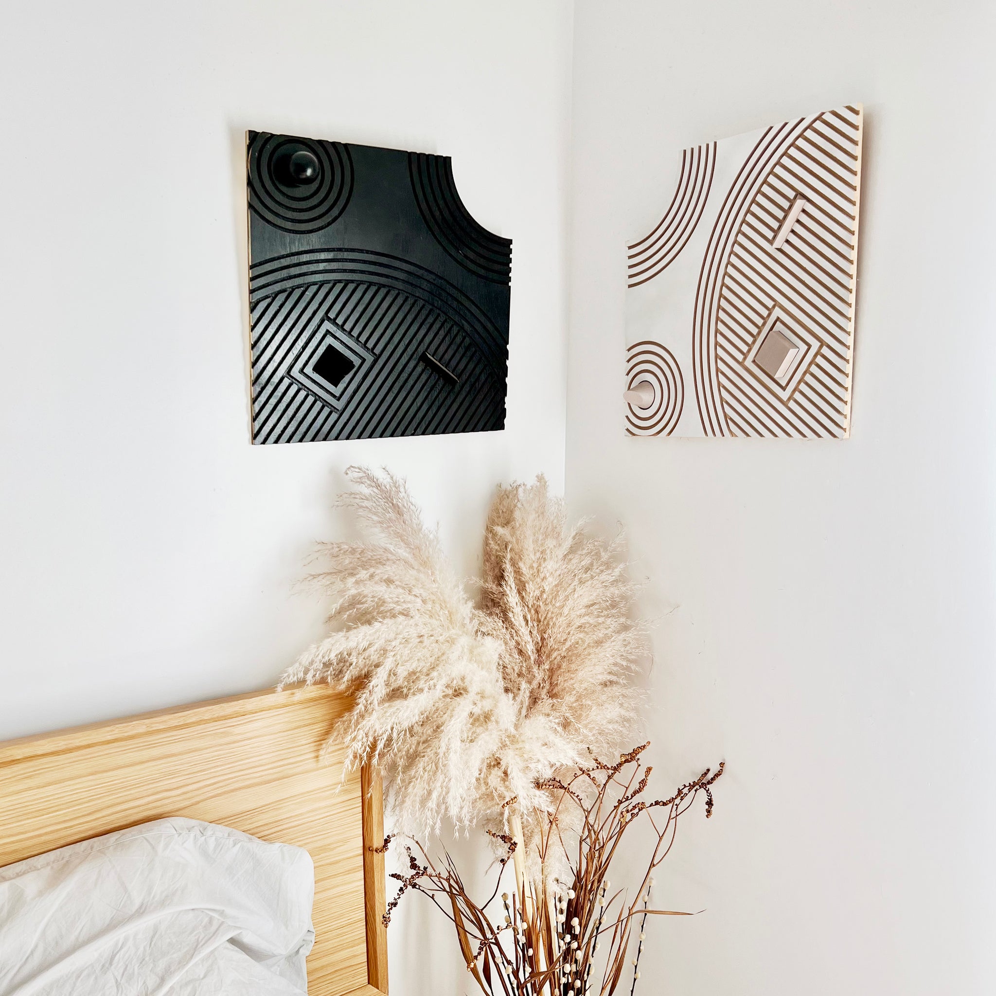 CNC-routed MDF wall art with projected 3D geometric solids, finished in acrylic-based paint. Available in Black and White.